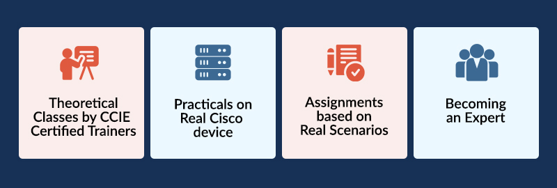 We have composed in-house practical work-books to help students practice multiple topology. We provide life-time access to inhouse practical workbooks. Students can practice real-life scenarios and improve their practical skills. These workbooks are created by CCIE experts who have 10 to 15 years of experience in the industry.