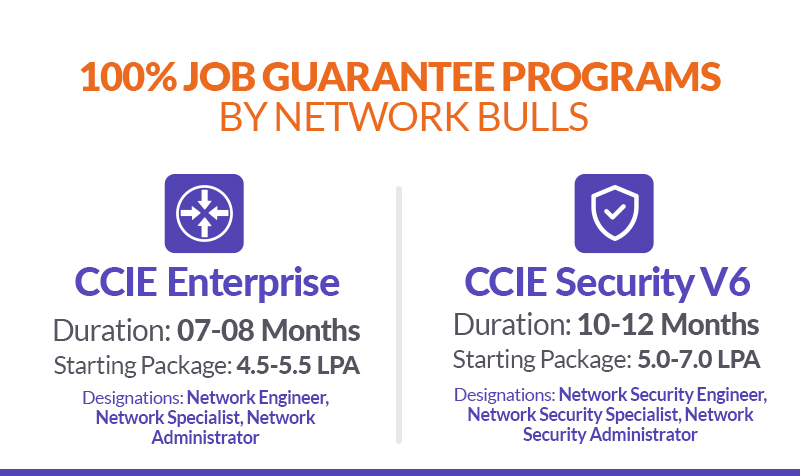 We provide 100% job Guarantee training programs for freshers in which we place them after their training completion and even before appearing for the CCIE Network Engineer certification exam.