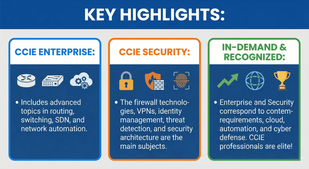 CCIE certification is merely a way of ensuring that your career will not be limited by the trends but will evolve with them. In case you move to the cloud, cybersecurity, or network automation, your CCIE will always be your foundation which will keep you relevant and highly demanded.
